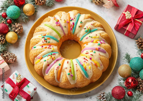 Festive Christmas Bundt Cake with Colorful Sprinkles and Holiday Decorations Perfect for Celebrations and Seasonal Treats