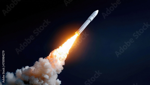 Hyperrealistic digital illustration of a rocket launching into the sky