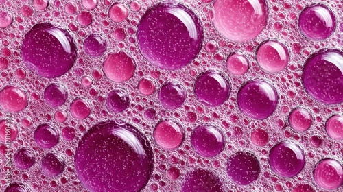 Abstract macro product photo of purple and pink liquid bubbles, vibrant texture detail, close-up studio shot background, modern art, bright colors, surface tension, scientific aesthetic
