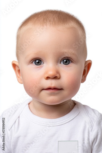 Close-up ID photo of a French baby boy with fair complexion on a white background