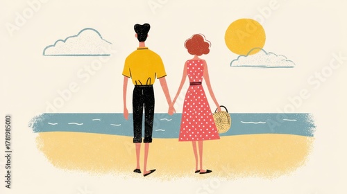 Couple holding hands on a sunny beach with retro illustration style