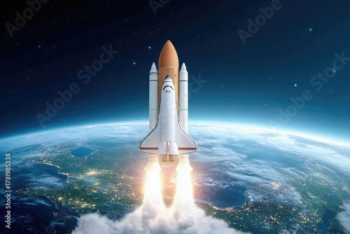 Futuristic space shuttle launch over Earth with fiery boosters igniting into the night sky