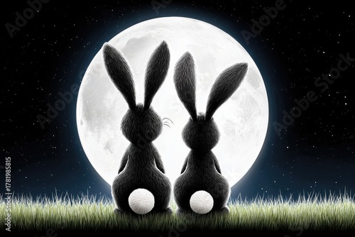Two rabbits silhouette on a hill under a full moon in a tranquil night sky