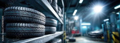 Tires stacked on shelves in an auto shop under blue garage lights with a busy atmosphere