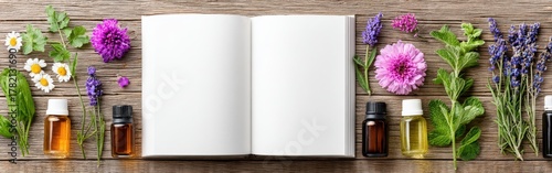 Open Blank Book With Essential Oil Bottles Flowers Herbs On Rustic Wood Background For Aromatherapy And Alternative Medicine Concepts