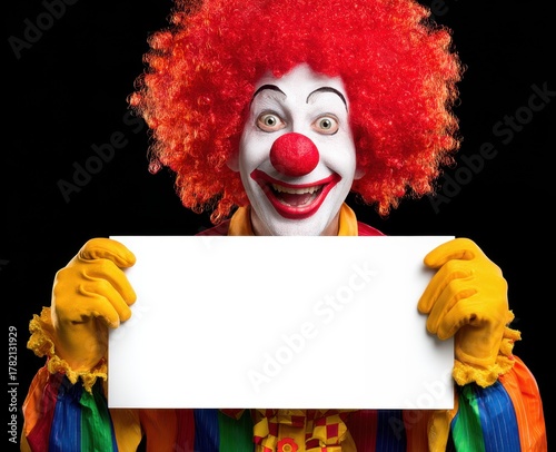 Clown With Red Wig Holding Blank White Sign On Black Background For Circus Or Party Advertisement And Entertainment