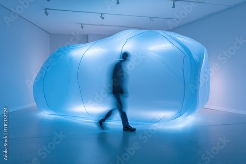Person walks inside a large blue inflatable tunnel in a white gallery space