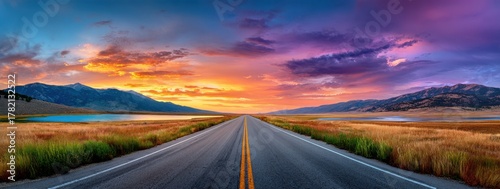 Scenic Highway Road Trip at Colorful Sunset With Mountains Lake and Grassland Landscape Travel Destination and Transportation Concept