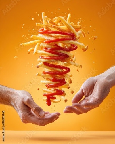 Dynamic display of a ketchup-draped french fries tornado spinning between two hands