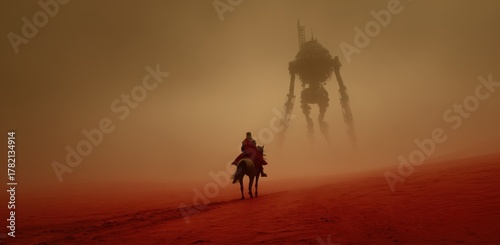 Fantasy scene with a horse rider facing a giant robot in a foggy desert landscape cinematic concept art science fiction illustration