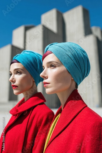Two models in blue turbans and red coats pose in bold fashion against concrete architecture