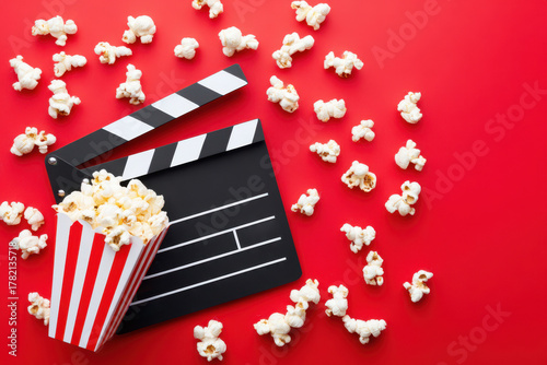 Movie Clapperboard And Popcorn Bucket On Red Background For Cinema Entertainment And Film Industry Related Projects And Designs