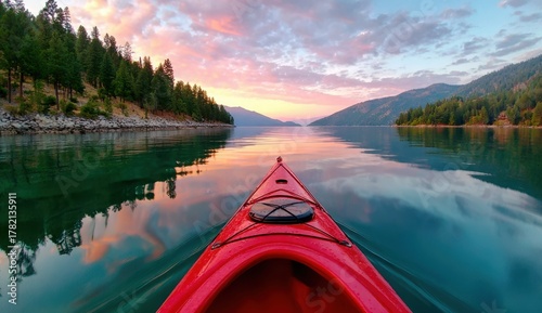 Kayaking On A Serene Lake At Sunset Peaceful Water Adventure Outdoor Recreation And Travel Destination Conce