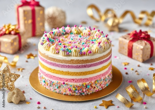 Celebration Cake With Sprinkles And Gifts Perfect For Birthdays And Special Occasions Festive Dessert