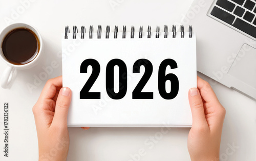 year planning concept hands holding notebook with future date coffee and laptop on white desk top view
