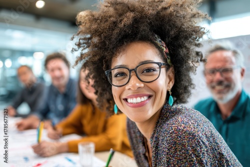 Smiling woman with curly hair and glasses in a vibrant office environment