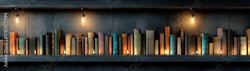 Bookshelf with Old Books and Edison Bulbs Vintage Style Dark Moody Interior Perfect for Library or Study Background