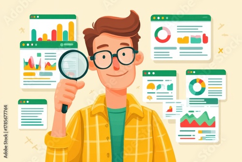 Man with magnifying glass examining charts and dashboards for data analysis concept in a business setting