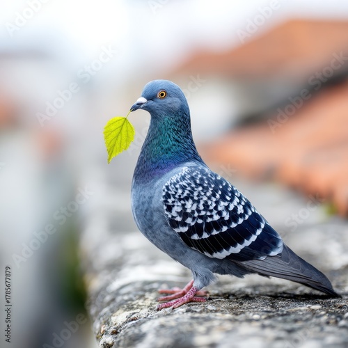 Pigeon on rooftop holding a bright green leaf in its beak, urban scene