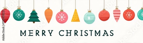 Merry Christmas festive hanging ornaments and colorful greeting card scene with baubles on strings