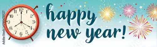 Festive Happy New Year Banner With Clock And Fireworks On Light Blue Background For Holiday Greetings And Celebrations Design