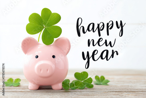 Pink Piggy Bank With Green Shamrock And Happy New Year Message On Wooden Surface For Luck And Financial Planning