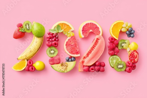 Creative Number Design Made Of Fresh Fruits On Pink Background Healthy Eating Concept For New Year Celebration