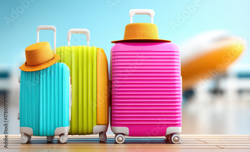Colorful Luggage Set With Hats At Airport For Summer Vacation And Travel Planning Featuring Pink Blue Green