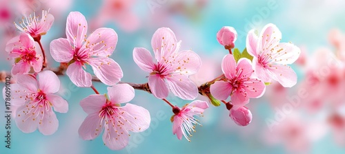 Delicate Pink Cherry Blossoms On Branch With Blue Background For Springtime Celebrations And Floral Designs Representing Renewal And Beauty