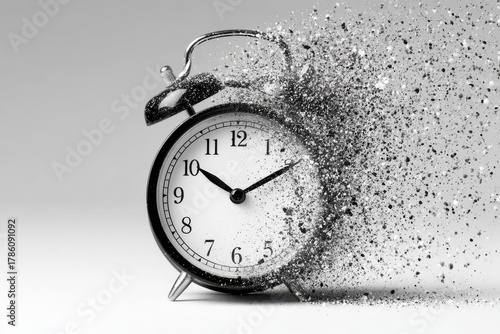 Alarm Clock Disintegrating Into Particles On White Background Conceptual Image Of Time Passing Deadline Aging Or Transience Studio Shot