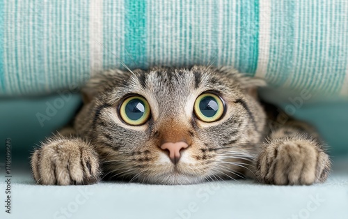 Frightened Tabby Cat Hiding Under Striped Blanket With Wide Eyes Looking Anxious And Scared Seeking Comfort