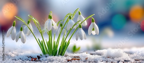 Snowdrop Flowers Blooming In Snow With Bokeh Background Symbolizing Spring Hope And New Beginnings In Nature