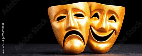 Golden Comedy and Tragedy Masks on Dark Background for Theater Performances and Dramatic Arts Presentations Symbolizing Duality and Human Emotion