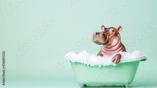 Cute hippopotamus taking a bubble bath in a small green bathtub