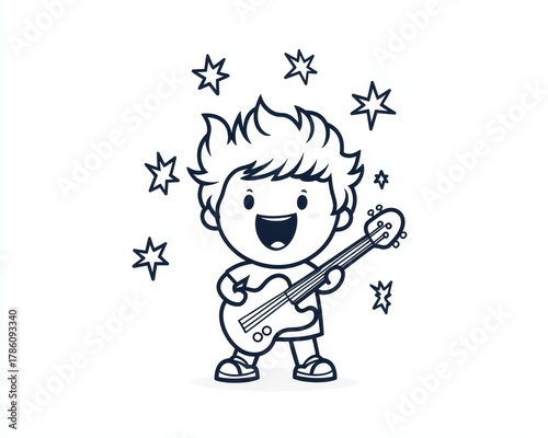 Cheerful cartoon child playing guitar with stars around for entertainment