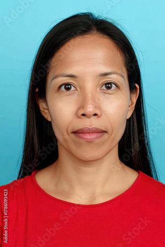 Photo ID portrait of an Asian Filipino woman in front-facing view with red shirt