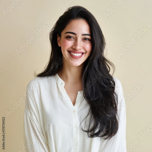 Confident Middle Eastern woman in her 20s with long hair in a professional attire, exuding poise and elegance against a neutral background.