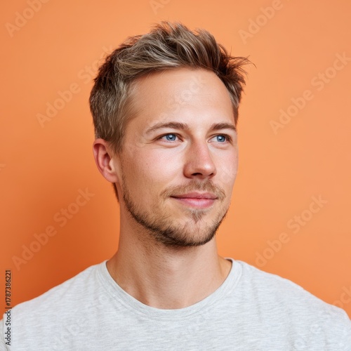 Smiling young Hungarian man with positive expression against orange background