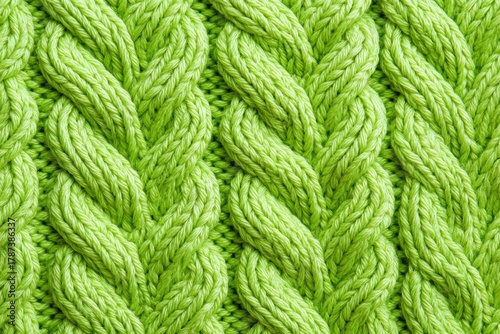 Close up of a detailed and vibrant green knitted braided pattern texture