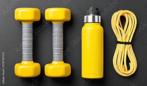 Yellow Dumbbells Water Bottle And Jump Rope On Dark Background For Fitness And Exercise Gym Equipment For Strength Training