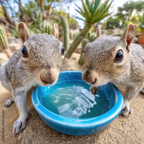 Two squirrels drink from a blue bowl outdoors in a sunny desert garden setting