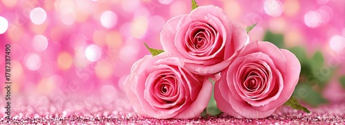 Three Pink Roses On Glitter Surface With Bokeh Lights Background For Valentine's Day And Romantic Occasions Love And Celebration Themes