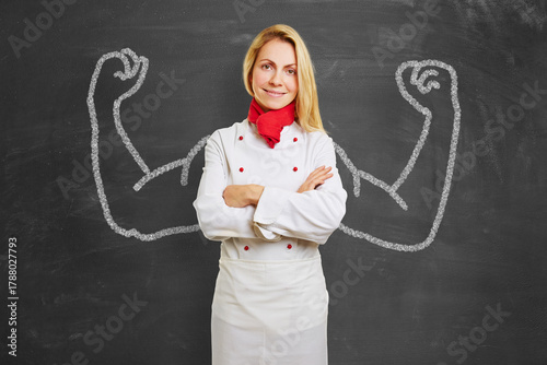 Junge Köchin vor Tafel mit Muskel Armen als Gastronomie Konzept