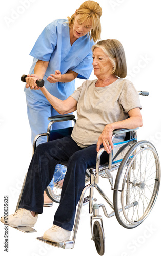 Elderly Woman in Wheelchair Doing Rehabilitation with Caregiver Assistance