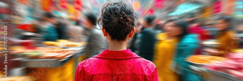 Woman In Red Shirt Facing Crowd At Market With Food Stalls And People Walking By Blurred Motion Effect For Commercial Use And Advertising