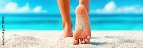 Bare Feet Walking On White Sand Beach With Turquoise Sea And Blue Sky Background For Summer Vacation And Relaxation