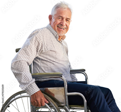 Glücklicher Senior als Patient im Rollstuhl nach Schlaganfall