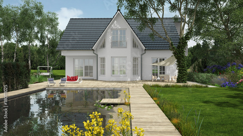 Modern house with green garden and solar panels on roof as sustainable renewable energy concept