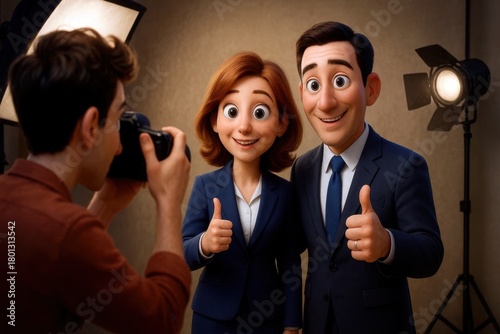 Cartoon Business Team Posing for Photographer in Studio with Thumbs Up Gesture Smiling and Wearing Suits for Corporate Photography