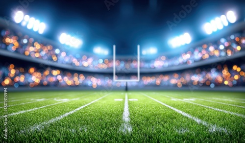 American Football Stadium With Green Grass Field And Goal Post Under Bright Lights For Sport Events And Championship